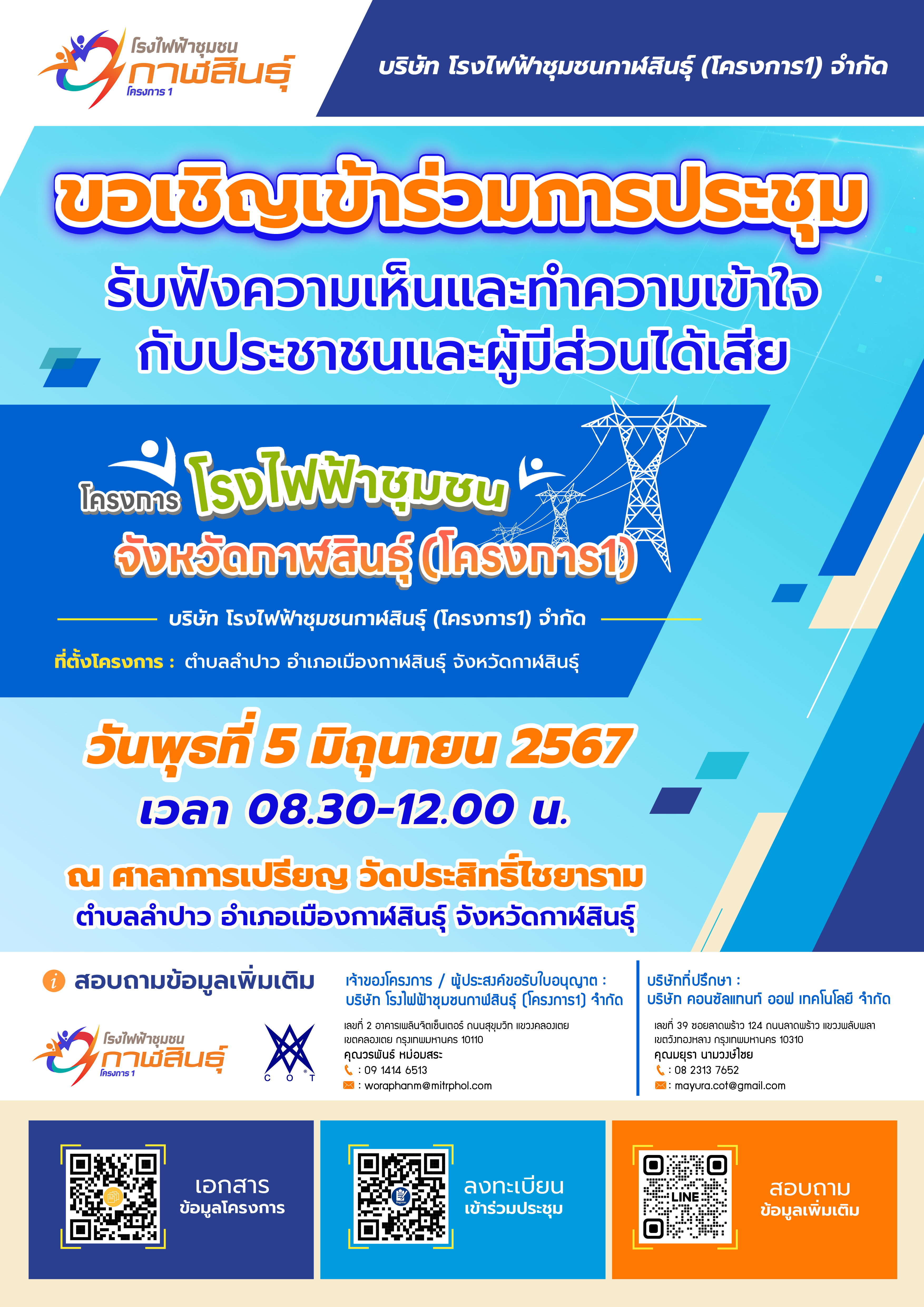 วันที่ 5 มิถุนายน 2567 ขอเชิญเข้าร่วมการประชุมรับฟังความเห็นและทำความเข้าใจกับประชาชนและผู้มีส่วนได้เสีย โครงการโรงไฟฟ้าชุมชนกาฬสินธุ์ (โครงการ 1) ของบริษัท โรงไฟฟ้าชุมชนกาฬสินธุ์ (โครงการ 1) จำกัด