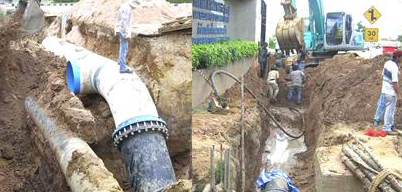 COT was responsible for the survey, design, and construction supervision of an HDPE PN 6.3 pipeline system including cast iron fitting material. The pipeline was approximately 2,000 m in length and 800 mm in diameter from starting point STA 126+190 to STA 128+190, parallel to the old pipeline.