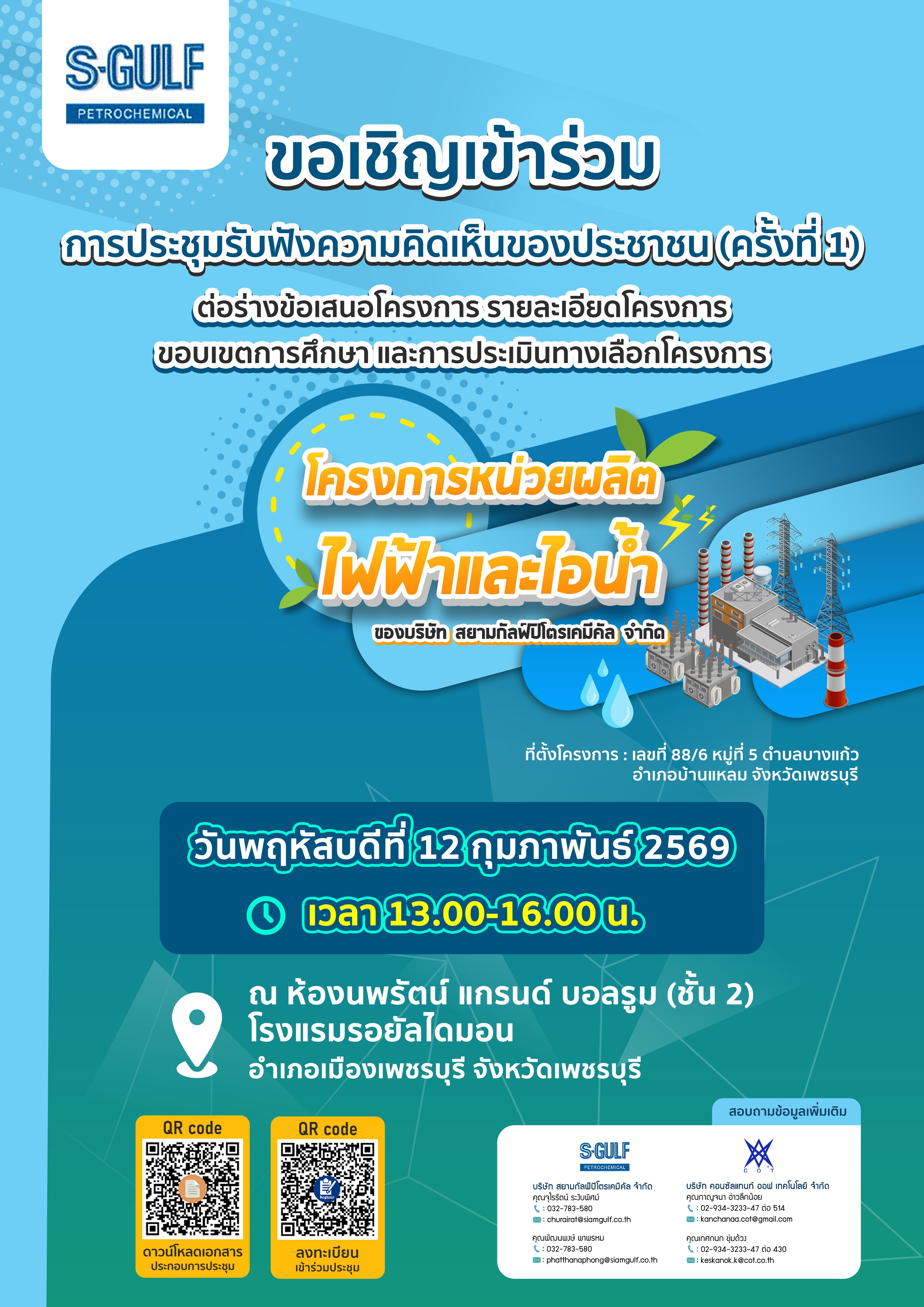 วันที่ 12 กุมภาพันธ์ 2569 ขอเชิญเข้าร่วมการประชุมรับฟังความคิดเห็นของประชาชน (ครั้งที่ 1) ต่อร่างข้อเสนอโครงการ รายละเอียดโครงการ ขอบเขตการศึกษา และการประเมินทางเลือกโครงการหน่วยผลิตไฟฟ้าและไอน้ำ ของบริษัท สยามกัลฟ์ปิโตรเคมีคัล จำกัด