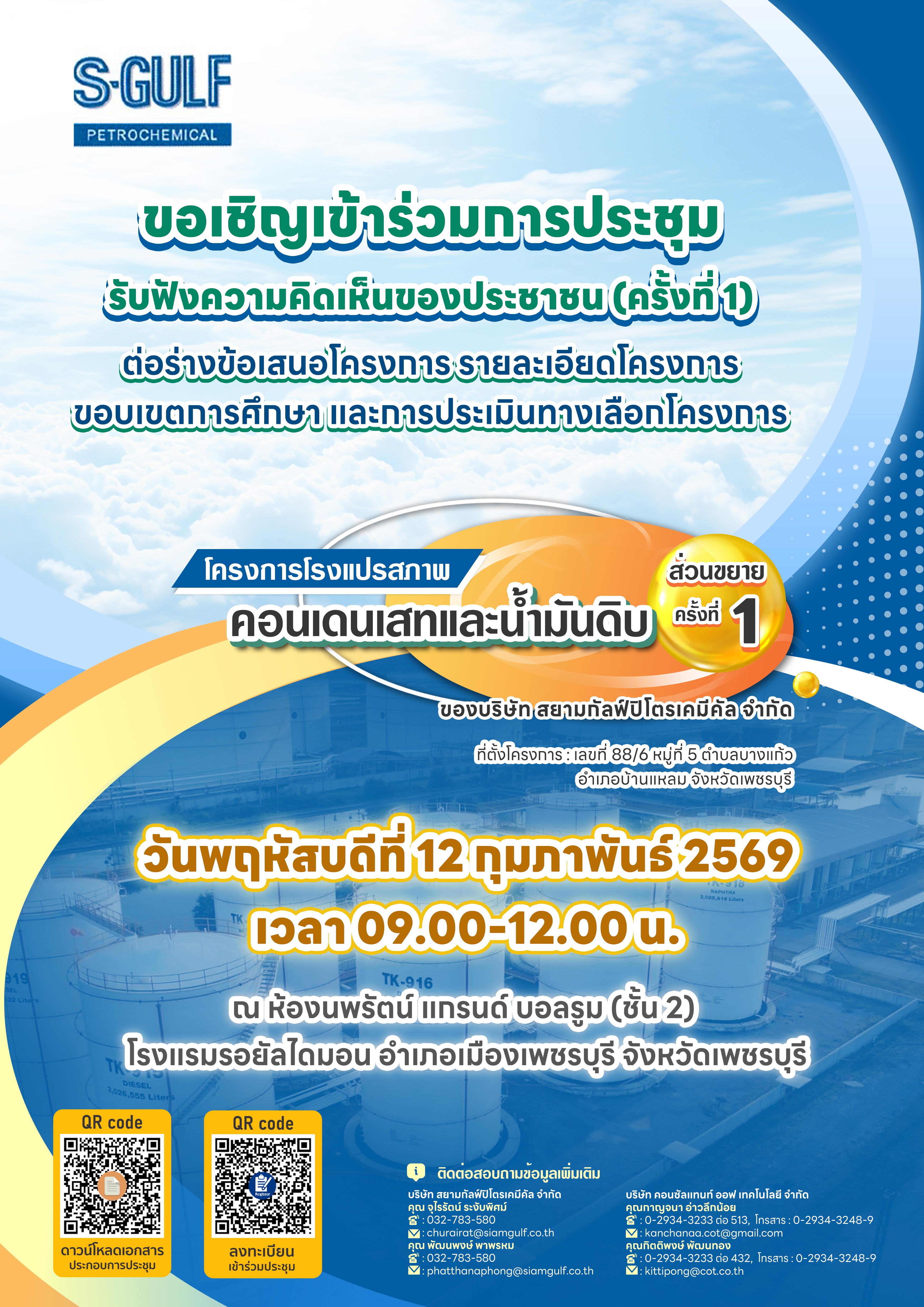 วันที่ 12 กุมภาพันธ์ 2569 ขอเชิญเข้าร่วมการประชุมรับฟังความคิดเห็นของประชาชน (ครั้งที่ 1) ต่อร่างข้อเสนอโครงการ รายละเอียดโครงการ ขอบเขตการศึกษา และการประเมินทางเลือกโครงการโรงแปรสภาพคอนเดนเสทและน้ำมันดิบ (ส่วนขยาย ครั้งที่ 1) ของบริษัท สยามกัลฟ์ปิโตรเคมีคัล จำกัด