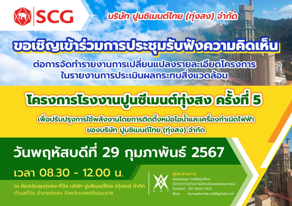 วันที่ 29 กุมภาพันธ์ 2567 ขอเชิญเข้าร่วมการประชุมรับฟังความคิดเห็นต่อการจัดทำรายงานการเปลี่ยนแปลงรายละเอียดโครงการในรายงานการประเมินผลกระทบสิ่งแวดล้อม โครงการโรงงานปูนซีเมนต์ทุ่งสง ครั้งที่ 5 เพื่อปรับปรุงการใช้พลังงานโดยการติดตั้งหม้อไอน้ำและเครื่องกำเนิดไฟฟ้า ของบริษัท ปูนซิเมนต์ไทย (ทุ่งสง) จำกัด