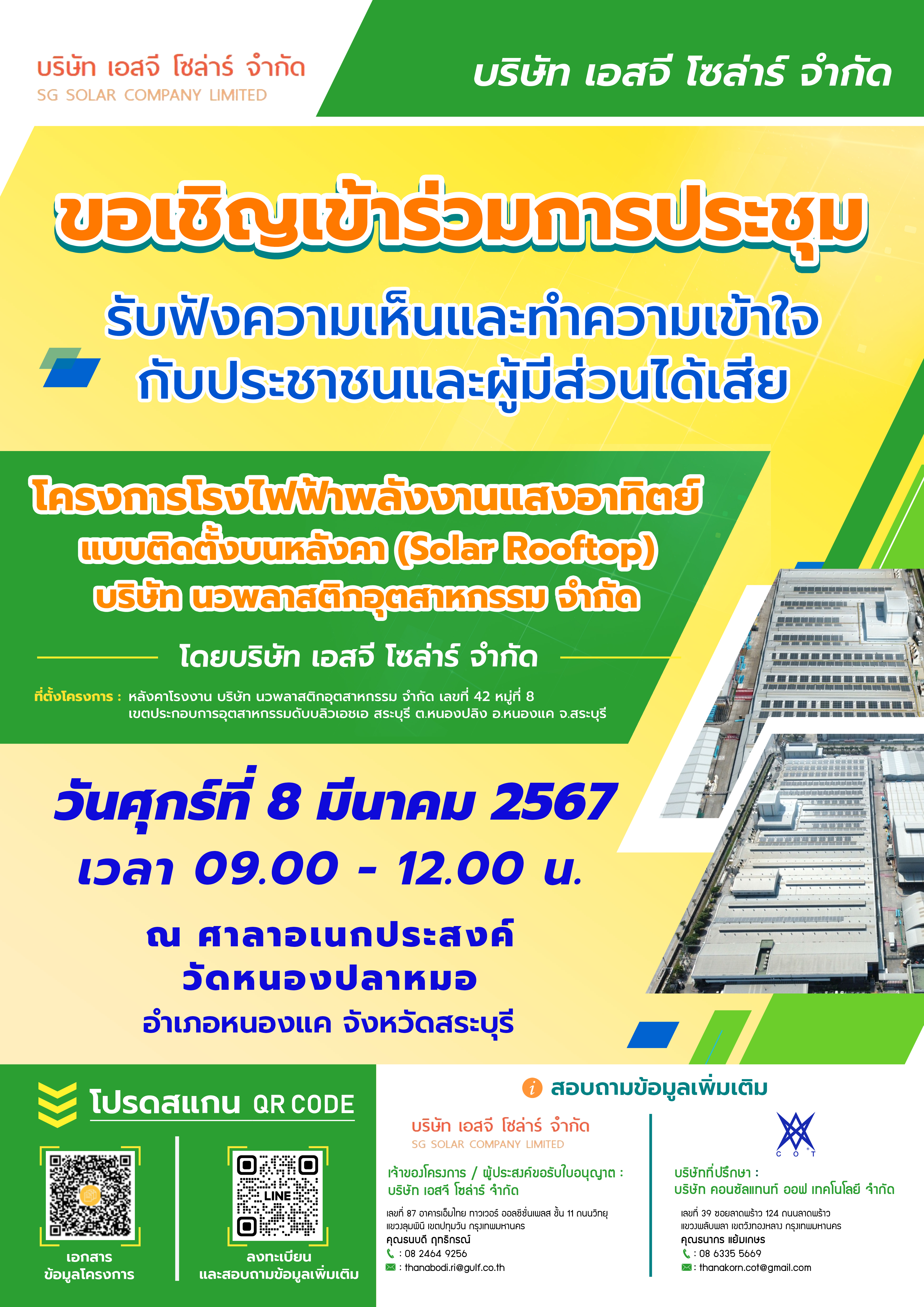 วันที่ 8 มีนาคม 2567 ขอเชิญเข้าร่วมประชุมรับฟังความเห็นและทำความเข้าใจกับประชาชนและผู้มีส่วนได้เสีย โครงการโรงไฟฟ้า พลังงานแสงอาทิตย์แบบติดตั้งบนหลังคา (Solar Rooftop) บริษัท นวพลาสติกอุตสาหกรรม จำกัด โดยบริษัท เอสจี โซล่าร์ จำกัด