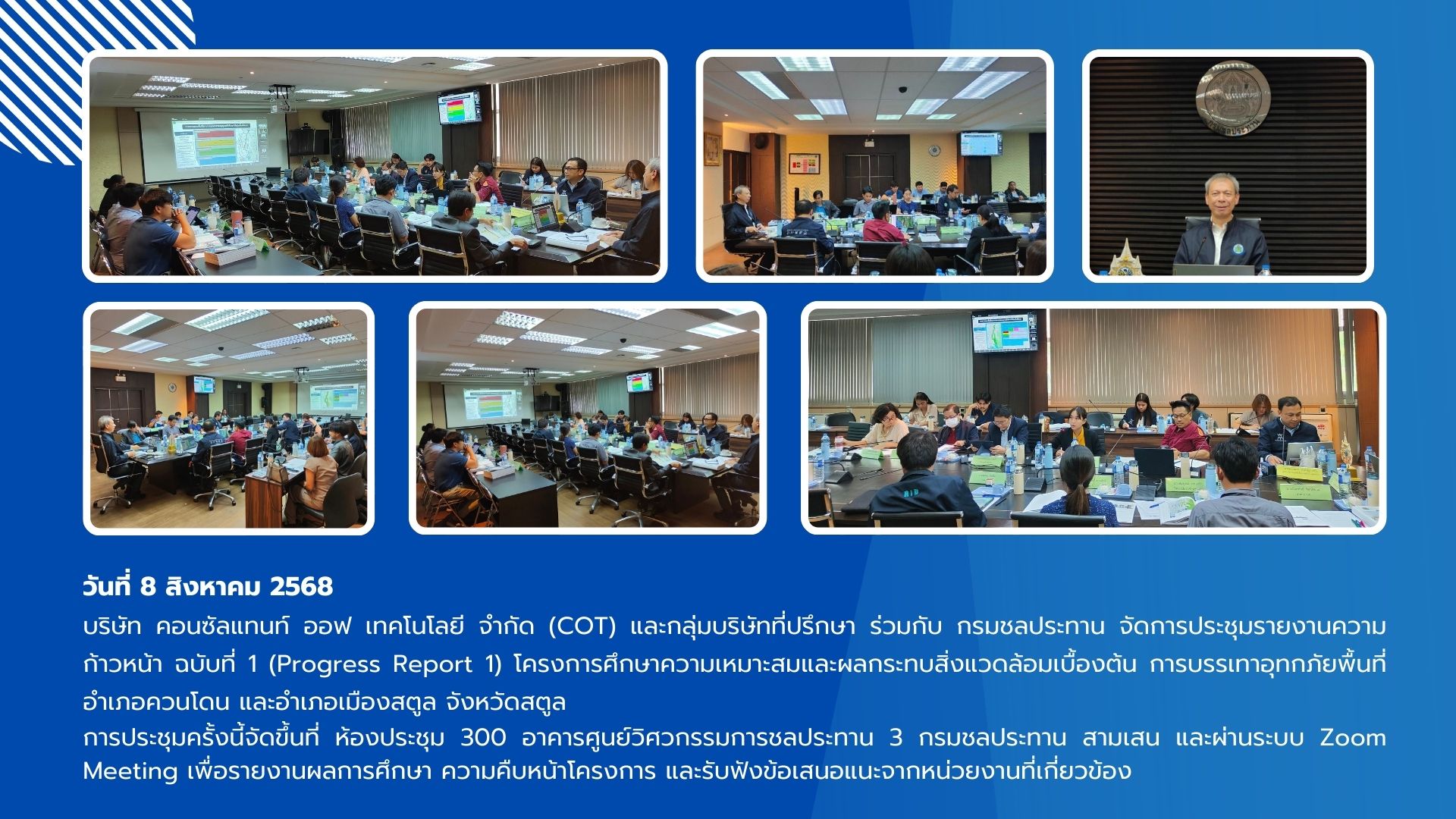 วันที่ 8 สิงหาคม 2568 COT และกลุ่มบริษัทที่ปรึกษา ร่วมกับ กรมชลประทาน จัดการประชุมรายงานความก้าวหน้า ฉบับที่ 1 (Progress Report 1) โครงการศึกษาความเหมาะสมและผลกระทบสิ่งแวดล้อมเบื้องต้น การบรรเทาอุทกภัยพื้นที่ อำเภอควนโดน และอำเภอเมืองสตูล จังหวัดสตูล