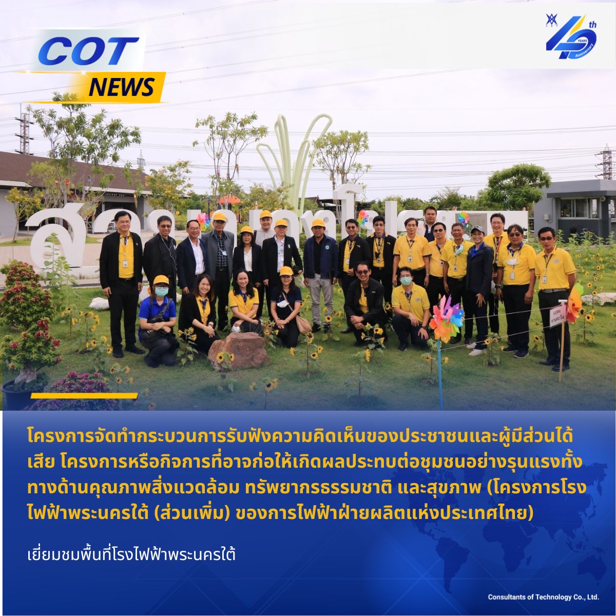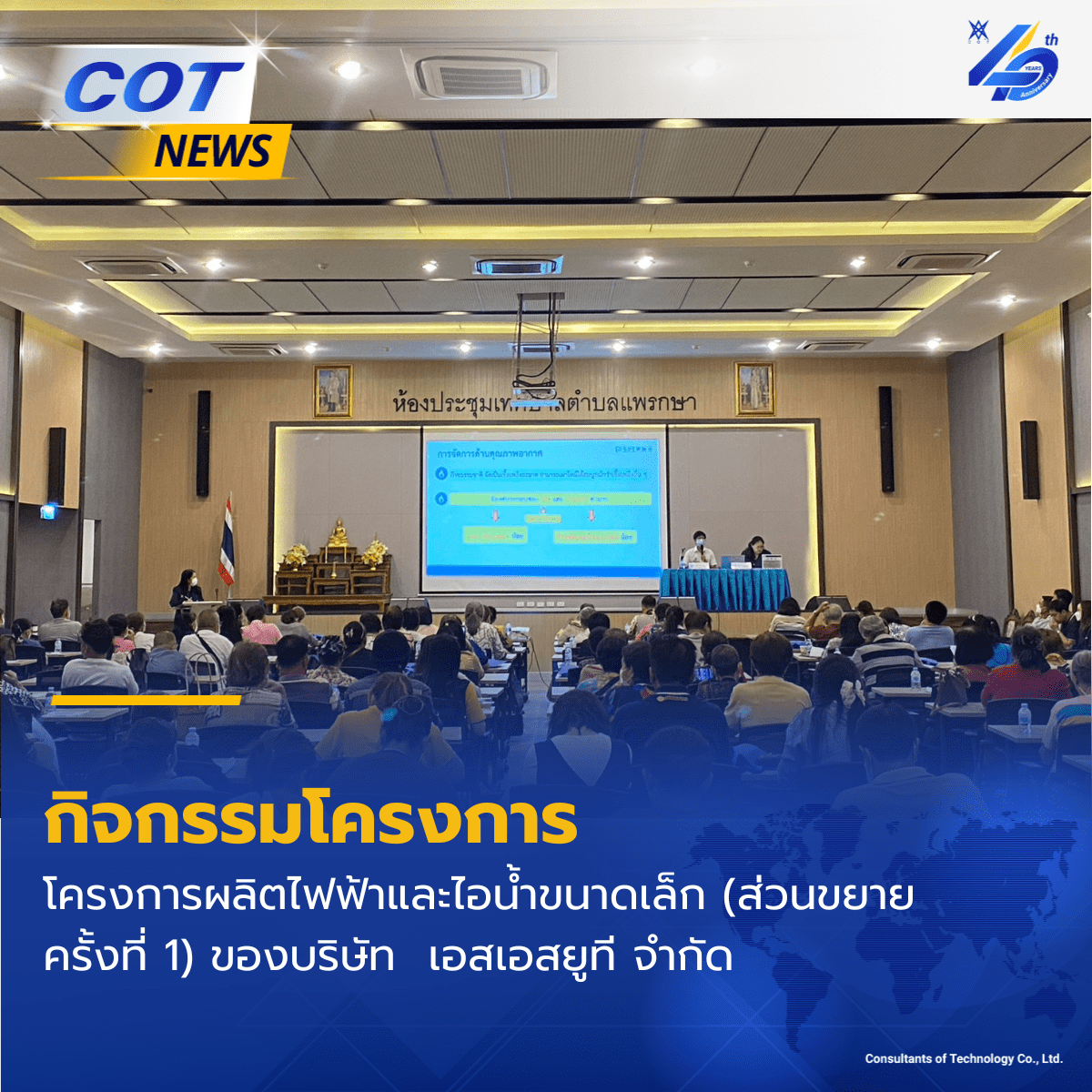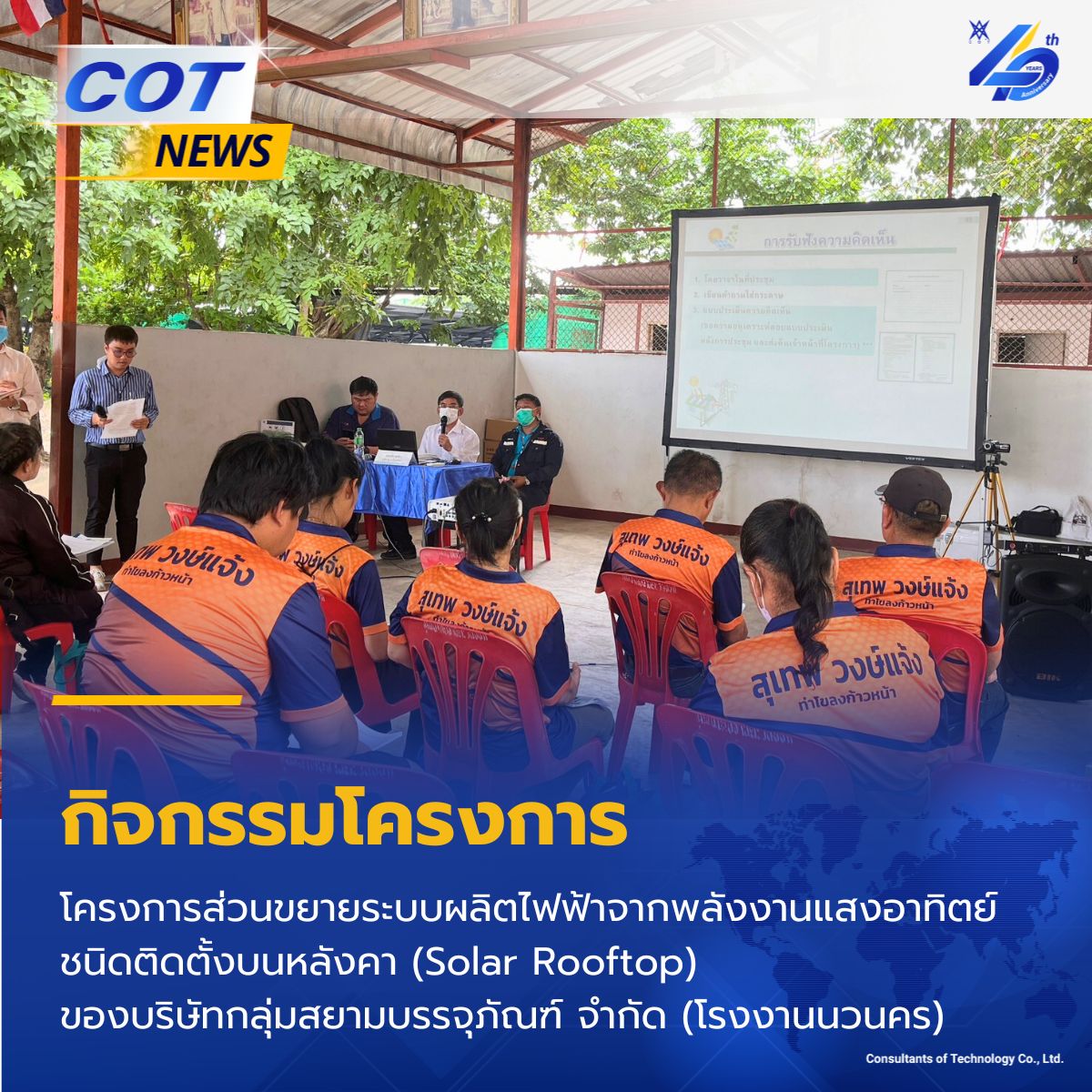 วันที่ 14 กันยายน 2566 COT จัดประชุมชี้แจงรายละเอียดโครงการและรับฟังความเห็นและทำความเข้าใจกับประชาชนและผู้มีส่วนได้เสีย โครงการส่วนขยายระบบผลิตไฟฟ้าจากพลังงานแสงอาทิตย์ชนิดติดตั้งบนหลังคา (Solar Rooftop) ของบริษัทกลุ่มสยามบรรจุภัณฑ์ จำกัด (โรงงานนวนคร)