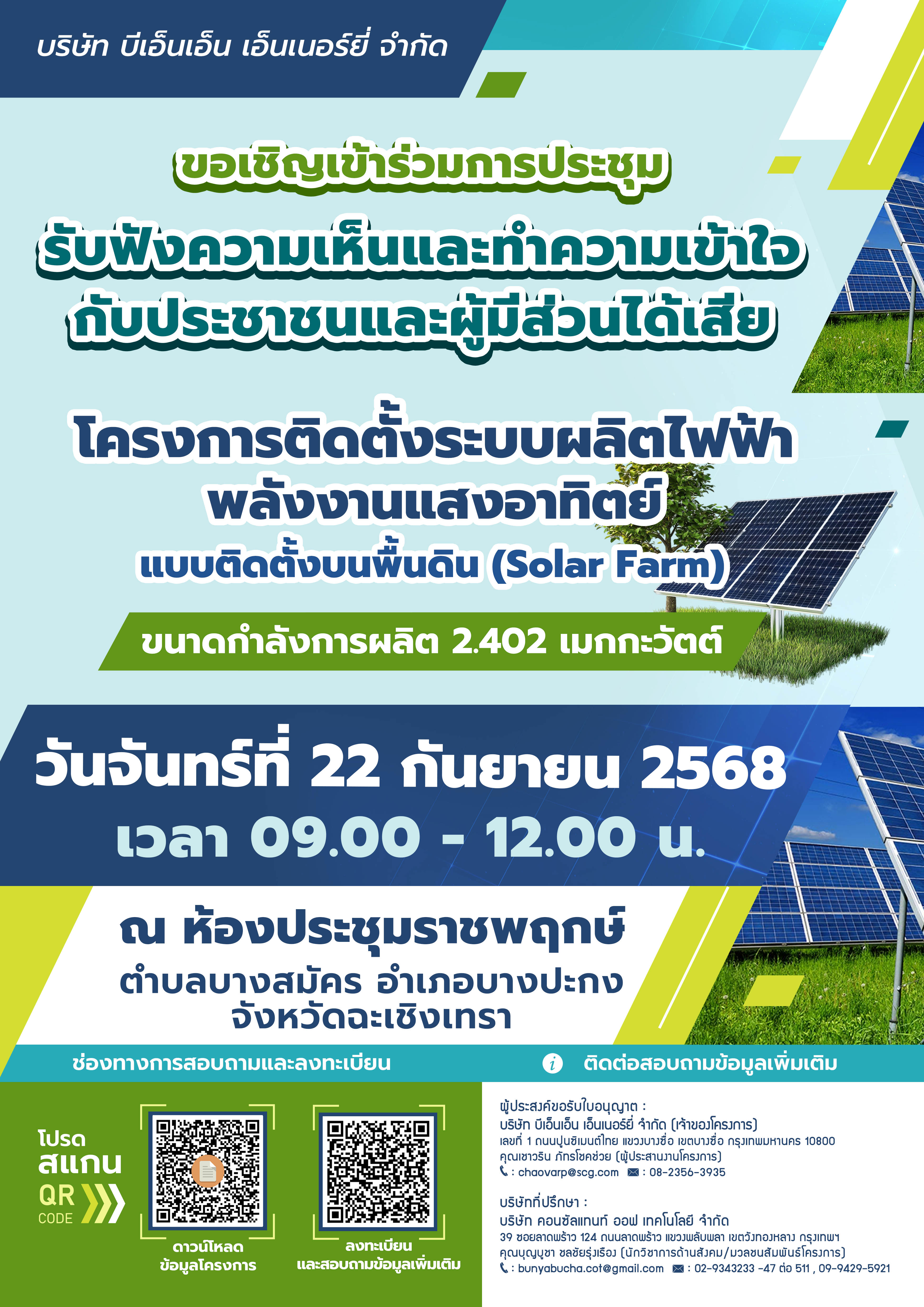 วันที่ 22 กันยายน 2568 ขอเชิญเข้าร่วมการประชุมรับฟังความเห็นและทำความเข้าใจกับประชาชนและผู้มีส่วนได้เสีย โครงการติดตั้งระบบผลิตไฟฟ้าพลังงานแสงอาทิตย์แบบติดตั้งบนพื้นดิน (Solar Farm) ขนาดกำลังการผลิต 2.402 เมกะวัตต์ ของบริษัทบีเอ็นเอ็น เอ็นเนอร์ยี่ จำกัด